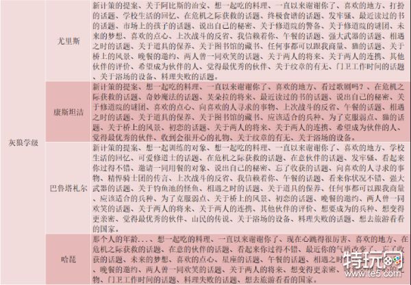 赛罗司教会角色蕾雅、伊艾里扎、安娜以及灰狼学级角色尤里斯、康斯坦洁、巴鲁塔札尔、哈琵话题选项选择