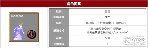吸血鬼幸存者兰巴角色怎么样?吸血鬼幸存者兰巴在20级之前等同于没有加成,不建议新手去使用的,需要玩家总共击败3000个牛奶元素去解锁的,下面就是小编带来的吸血鬼幸存者兰巴角色属性一览,快来看看吧!