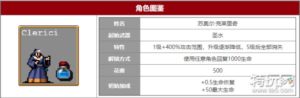 苏尔·克莱里奇的起始武器是圣水。使用任意角色回复1000生命,即可解锁她,解锁后花费500金币购买才可使用。