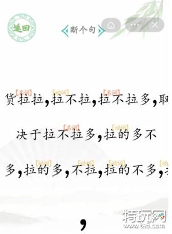 汉字找茬王断句6关卡怎么过?断句6货拉拉拉不拉怎么断句?这个关卡名为断句6,这段有些绕口的字句需要玩家准确的断句,具体断句攻略这里为大家介绍,可以来看看。