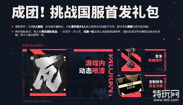 完成5人集结,在全面不删档后,小队集齐至少3人进入游戏并完成新手引导,即可全队解锁无畏小队奖励,包括游戏内动态喷漆、首发枪械挂件和定制称号:“先瓦为敬”。