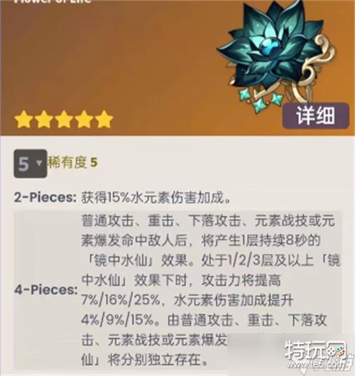 四件套:普通攻击、重击、下落攻击、元素战技或元素爆发命中敌人后,将产生1层持续8秒的「镜中水仙」效果。处于1/2/3层及以上「镜中水仙」效果下时,攻击力将提高7%/16%/25%,水元素伤害加成提升4%/9%/15%。由普通攻击、重击、下落攻击、元素战技或元素爆发产生的「镜中水仙」将分别独立存在。