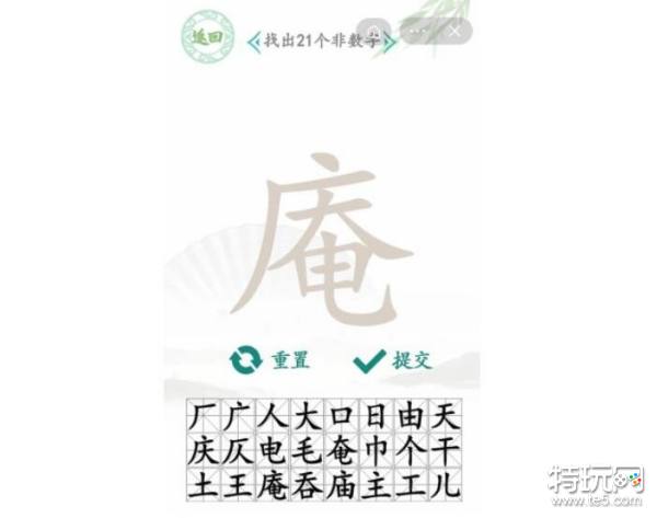汉字找茬王这款游戏是抖音上最近比较火爆的一款文字类型的游戏,在游戏中有着非常多的关卡可以挑战,玩家在关卡中需要通过组词,消除,连线的方式来完成关卡,每个关卡也都有着不同的主题,其中有很多小伙伴不知道-汉字找茬王庵找出21个字通关方法是什么,下面就跟着小编一起来看看吧。