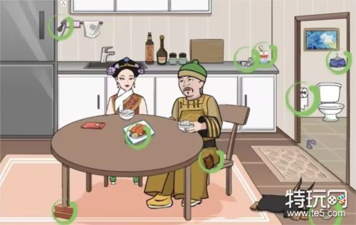 2、点击桌子上的红包可以找到【小额红包】,桌上放着【看图当菜】,向左滑动脱下男士鞋子可以看到【破洞袜子】,柜子上放着【矿泉水刷杯】和【挤净牙膏】,向右滑动柜门可以看到【好评返现】,卫生间里有【节约厕纸】和【破洞裤衩子】,狗狗的碗是【破碗】。