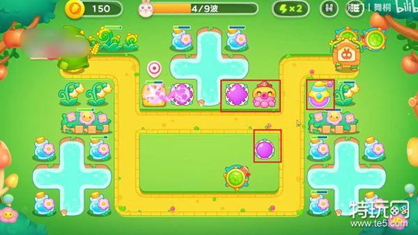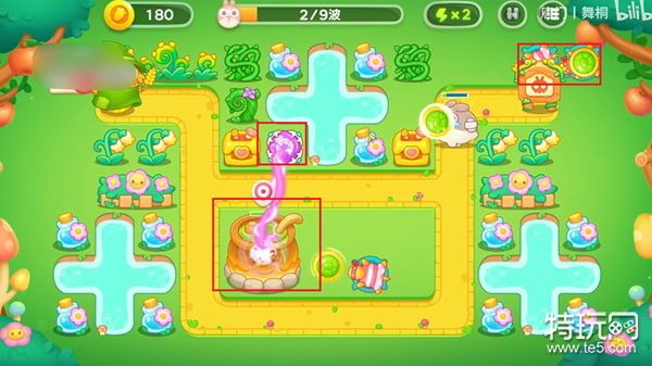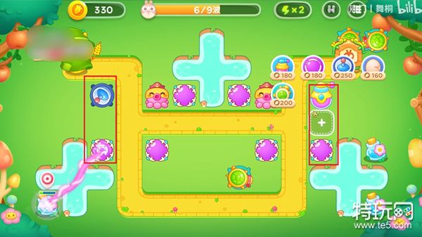 3、有钱就升级已经放置的炮台,还有钱就放更多的魔法球,在第六波的时候去左边建造两个炮塔,用来清理最后的道具。