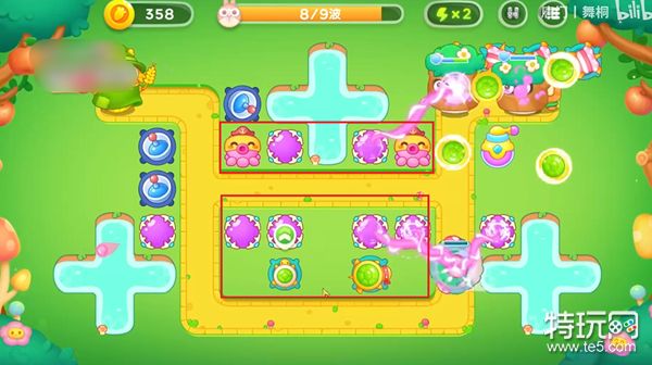 1、首先我们在出口放置两个乌龟,升到二级,然后在左侧放置一个乌龟壳和一个魔法球,清最大的道具。