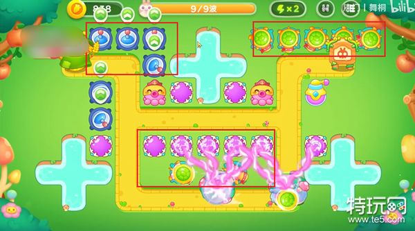 2、及时清理道具,然后在下面再放一个乌龟和魔法球,中间十字池塘旁边放置两个三级的魔法球和章鱼。