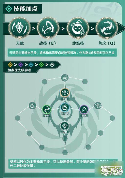 桑博的天赋技能是主要输出手段,所以技能加点以天赋、战技、终结技、普攻的顺序加点,如果追求输出需要加点战技和普攻,如果作为副C则不用加点。