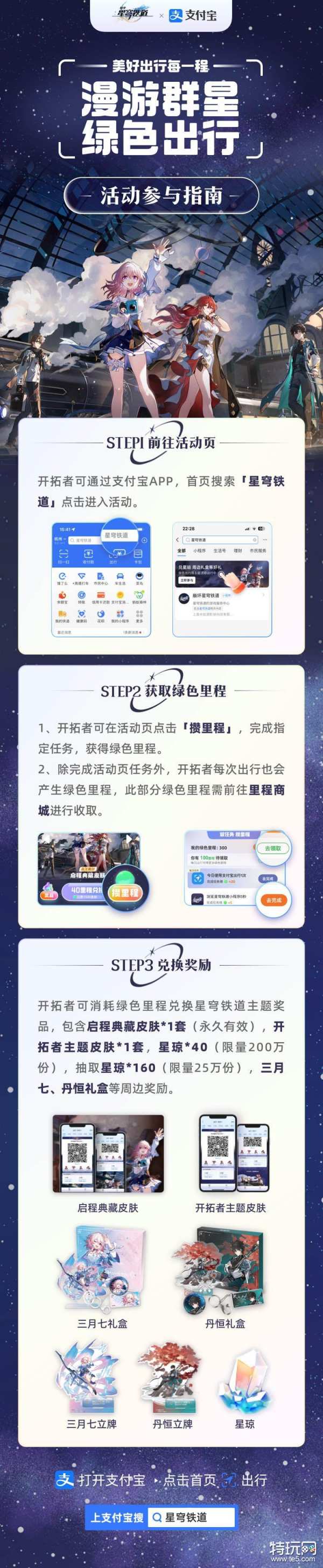 ● 消耗绿色里程即有机会兑换星穹铁道主题奖品:启程典藏(支付宝出行)皮肤*1套(永久有效),开拓者主题(支付宝)皮肤*1套,星琼*40(限量200万份),抽取星琼*160(限量25万份),三月七角色礼盒、丹恒角色礼盒等福利。