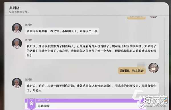 当短信中收到奥利格消息时,完成对话并回复就可以领取寻药溯源任务了,奖励有300里程和30星穹,以及基础的升级资源。追踪任务后跟着系统指引来到磐岩镇的诊所,找娜塔莎对话,受委托去找3个没复诊的病人询问原因,全部找到后有2个选择,建议点直接跑回去告诉娜塔莎,不然另一个选项会多跑点路。