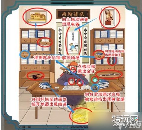 2.向上拖动画卷出现兔首,将钥匙拖给锁,解锁抽屉。