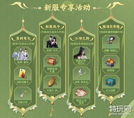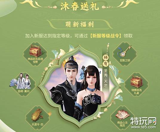 沐春送礼: 达到指定等级即可通过【新服等级战令】领取超丰厚萌新奖励!绝美外观【圣绣·素问】、【圣绣·天芒】、定数之钥、珑铸自选礼盒等豪礼均可领取,还有【签到有礼】、【江湖之路】等新服专属活动,可领【神品伙伴·明月心】、【灵殊·梦未央】等专属福利,助力少侠闯荡江湖!