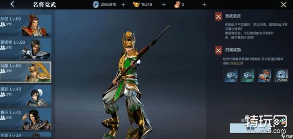 达到六十级,陆续解锁出孙权、马超等4位武将供大家挑战。挑战成功得到的奖励会更多。和四十级相比,获得的蓝色兵印礼包翻一倍,获得的绿色兵印礼包多三个,将星石匣增加五个,多5000个铜币。